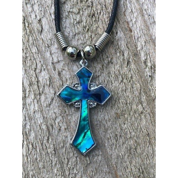 Cross design Tide Jewellery inlaid blue Paua shell pendant on 18″ black cotton thong.